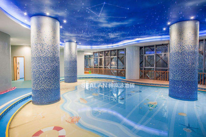 游泳池马赛克拼花:常规颗粒选择:陶瓷23*23mm、25*25mm、48*48mm。性价比最高的是纯色釉面48*48mm,适合用于大型户外泳池小区、水上乐园、戏水池、冲浪池、私人别墅池等。免费设计!