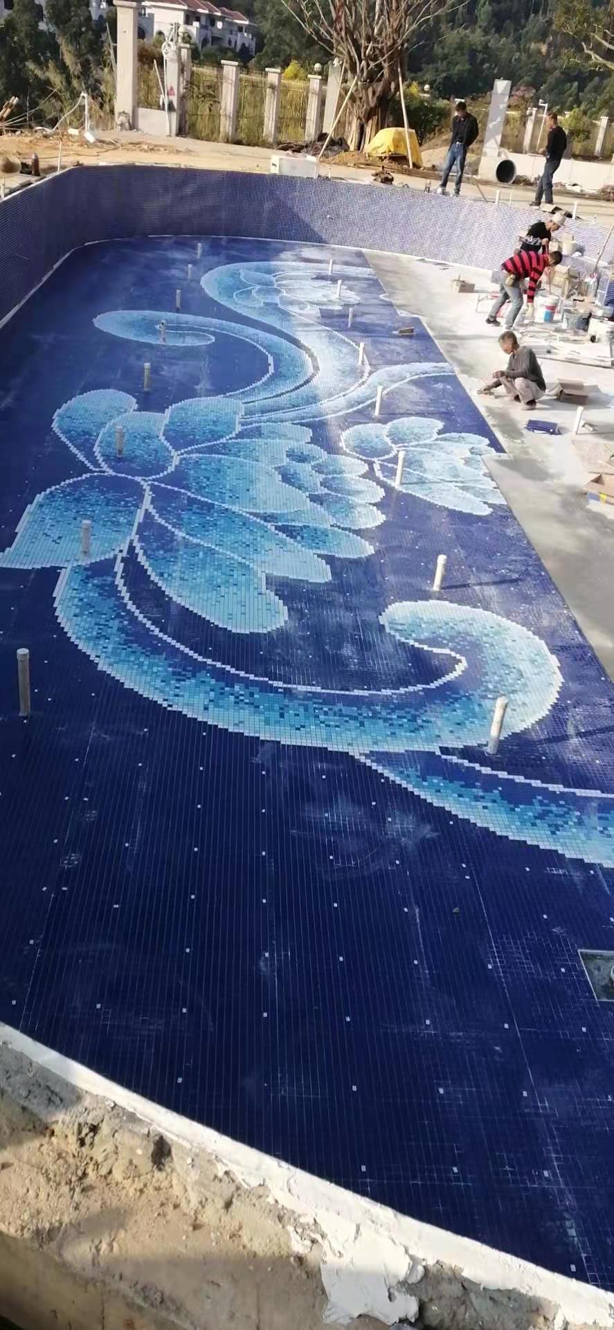 泳池马赛克拼花,项目名称:开平桂碧园内,采用25*25陶瓷马赛克颗粒,整体颜色为深蓝色,花瓣采用深中钱天蓝渐变效果。 以上出自绅岚泳池砖官网,http://www.sealandpool.com/.